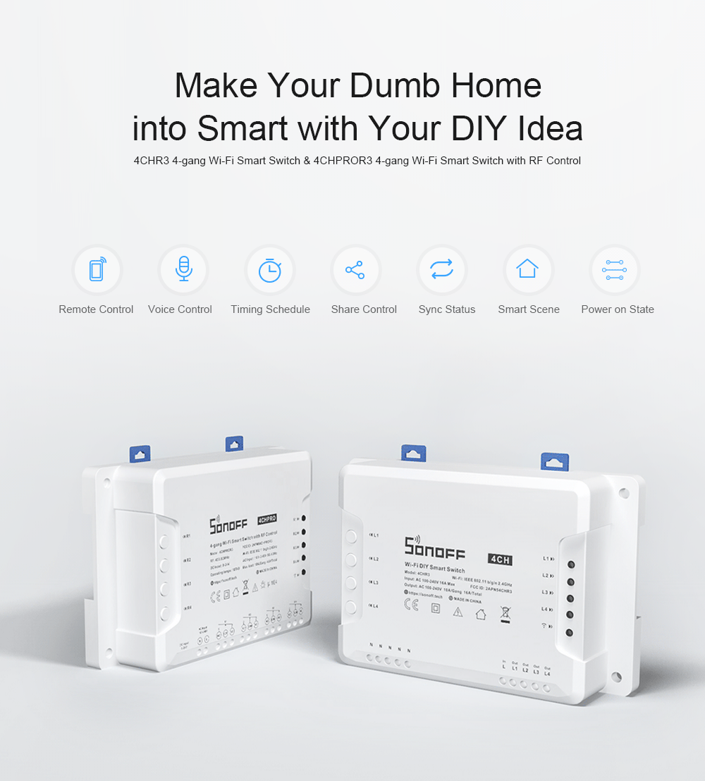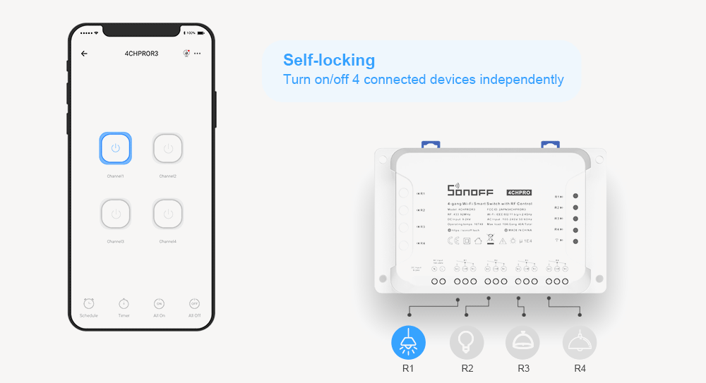 | Specification | – Model : 4CH R3 – Product Type : Smart Switch Module – Voltage : 100-240V AC 50/60Hz – Dimension : 145x90x34mm – Casing material : PC V0 – Wi-Fi : IEEE 802.11/b/g/n 2.4GHz – Work Temperature : -10°C~40°C – Working Humidity : 5%-95%RH, non-condensing – Wiring Way : N and L |