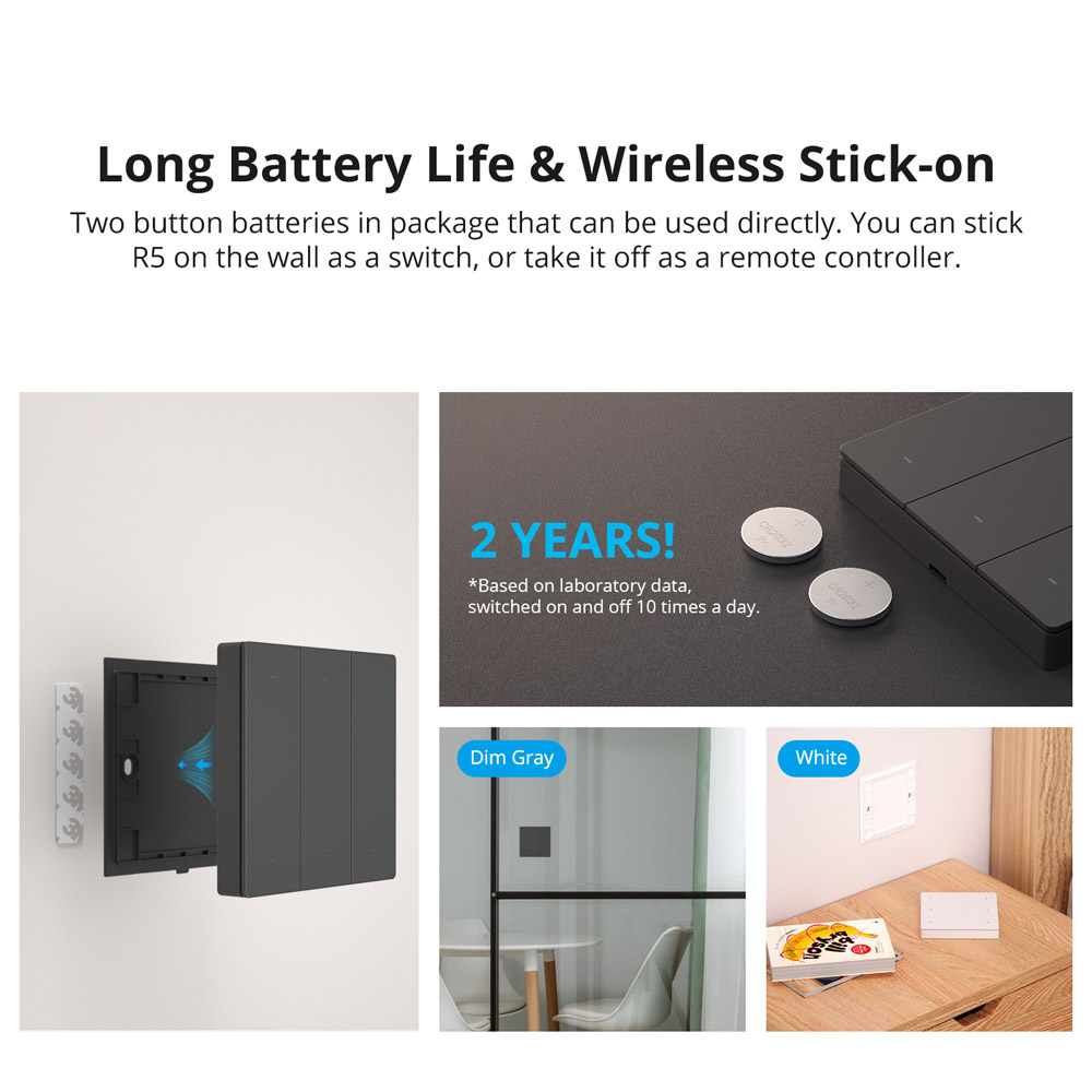 - ป็นสวิตช์กดไร้สายใช้งานร่วมกับอุปกรณ์ Sonoff eWeLink-Remote เพื่อใช้ควบคุมอุปกรณ์สมาร์ทโฮมต่างๆของ Sonoff ได้อย่างมีประสิทธิภาพ