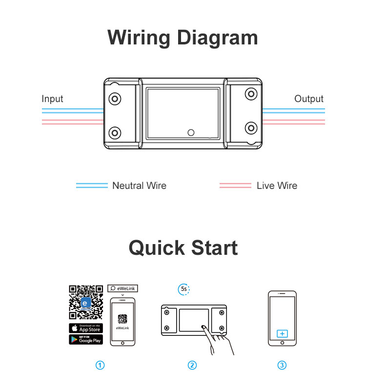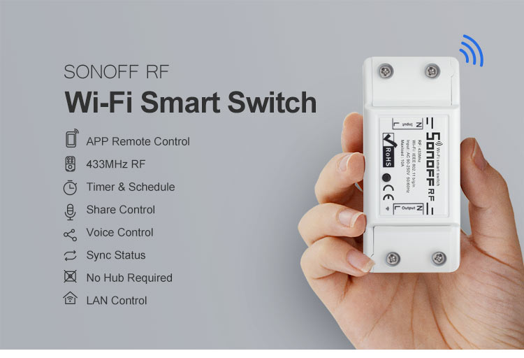 | Specification | – Model : RF R2 – Product Type : Smart Switch Module – Voltage : 100-240V AC 50/60Hz – Max Load : 10A/2200W – Support 433 MHz RF Control – Dimension : 88x39x24mm – Casing Material : PC V0 – Wi-Fi : IEEE 802.11/b/g/n 2.4GHz – Work Temperature : -10°C~40°C – Working Humidity : 5%-95%RH, non-condensing – Wiring Way : N and L |