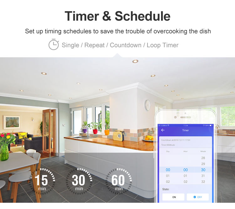 - สามารถตั้งตารางเวลาเปิด-ปิดได้สูงสุด 8 ช่วง/นับเวลาถอยหลัง/โดยที่ตารางเวลาที่ตั้งไว้แล้วในแอปพลิเคชัน จะยังคงทำงานได้ตามปกติ แม้จะไม่มีสัญญาณ Wifi ก็ตาม
